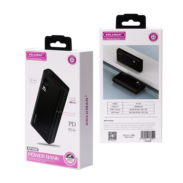 پاوربانک Koluman مدل KP-026 با ظرفیت ۲۰۰۰۰ میلیآمپر ساعت، گزینهای ایدهآل برای افرادی است که به دنبال یک شارژر همراه قدرتمند، ایمن و مجهز به فناوریهای روز هستند.